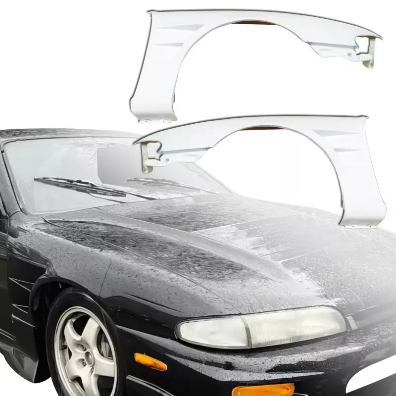 This is a BSPO Wide Body 30mm Fenders (front) manufactured or distributed by ModeloDrive with FRP being the primary exterior surface material. ModeloDrive FRP (fiberglass) parts are made to a higher standard than most mass produced US market fiberglass parts. Holes will not always be pre-drilled so you still will need to dry fit the parts before they can be prepped and finished. Due to the nature of fiberglass there may be cracks or surface imperfections that need filled and/or leveled. This should be fixed in the prep stage of installation at a professional body shop. Bolts, screws, and double sided tape is not included. All ModeloDrive fiberglass parts require modification, shaving, sanding, drilling, filling in order to ensure proper fitment but generally speaking less than the competition.