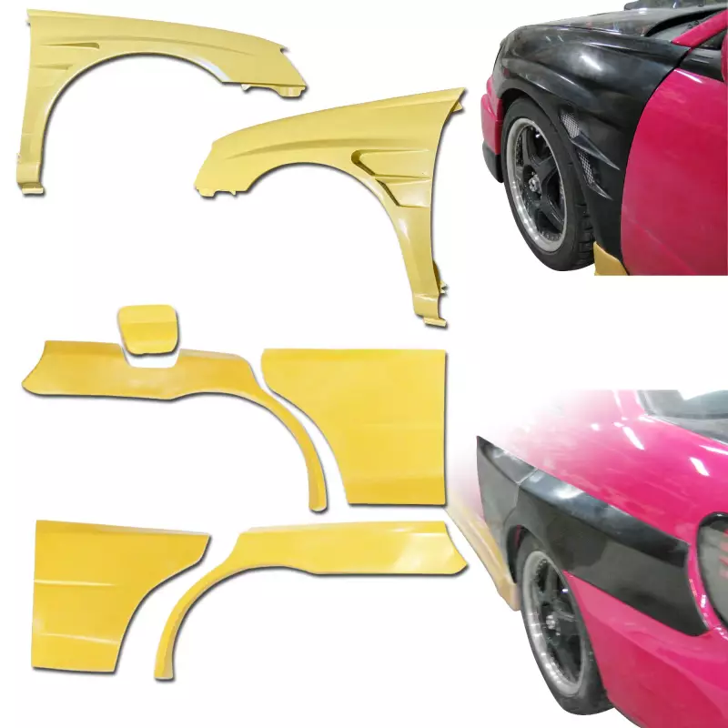 This is a CSPE Wide Body Fenders Set 7pc manufactured or distributed by ModeloDrive with FRP being the primary exterior surface material. ModeloDrive FRP (fiberglass) parts are high quality aero parts now available to the US market. ModeloDrive FRP aerodynamics have set a new standard for the fiberglass market. You may need to dry fit the parts and drill holes before prepping and finishing. Fiberglass may have cracks or surface imperfections that need filling and/or leveling. A professional body shop should fix any issues in the prep stage of installation and install the parts. You will need bolts, screws, and double sided tape, which are not included. All ModeloDrive fiberglass parts require modification, shaving, sanding, drilling, filling, cutting to ensure proper fitment but usually less than the competition.