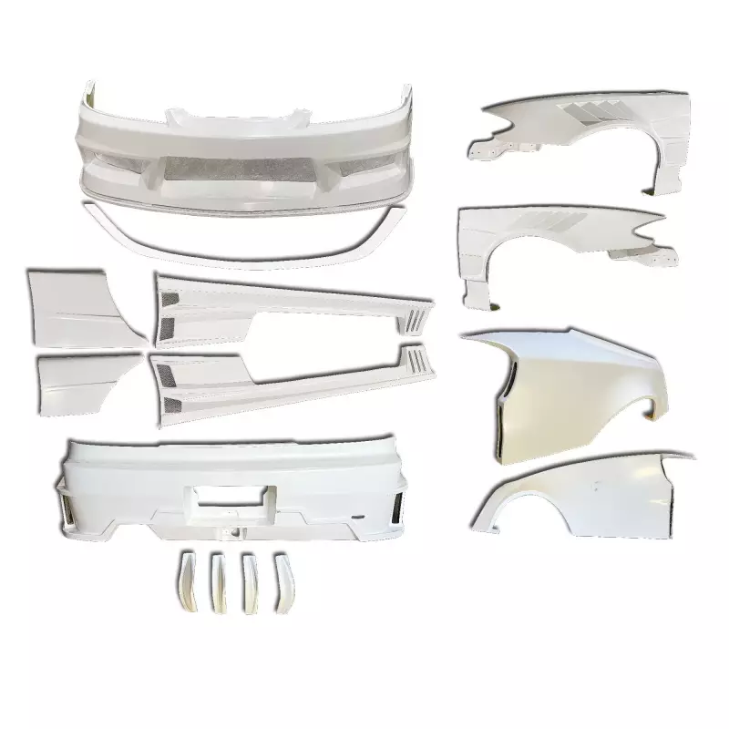 This is a DMA RS Wide Body XL Kit manufactured or distributed by ModeloDrive with FRP being the primary exterior surface material. ModeloDrive FRP (fiberglass) parts are made to a higher standard than most mass produced US market fiberglass parts. Holes will not always be pre-drilled so you still will need to dry fit the parts before they can be prepped and finished. Due to the nature of fiberglass there may be cracks or surface imperfections that need filled and/or leveled. This should be fixed in the prep stage of installation at a professional body shop. Bolts, screws, and double sided tape is not included. All ModeloDrive fiberglass parts require modification, shaving, sanding, drilling, filling in order to ensure proper fitment but generally speaking less than the competition.