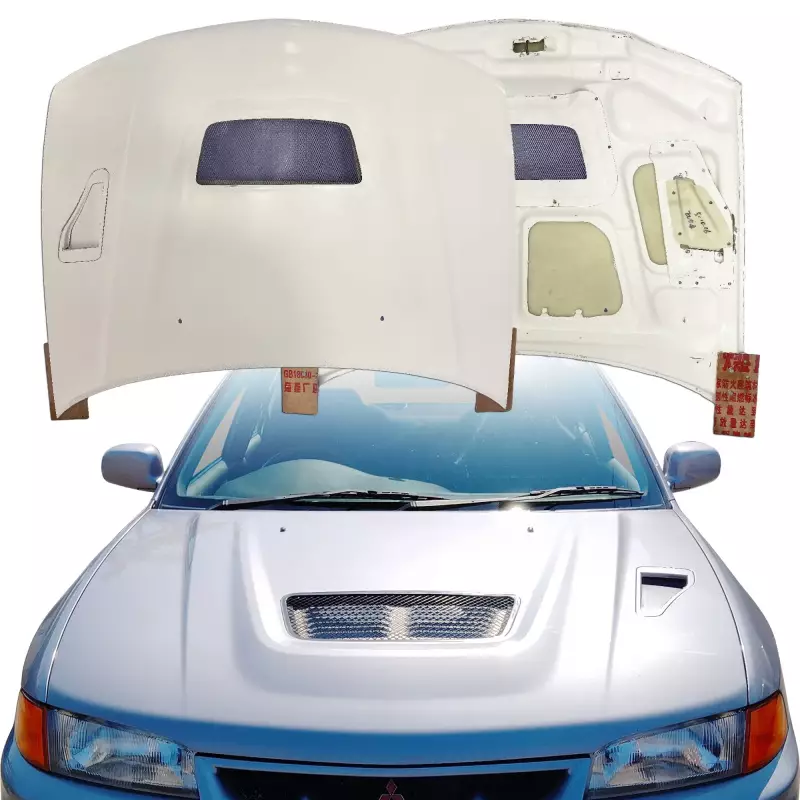 This is a EVO4 Hood manufactured or distributed by ModeloDrive with FRP being the primary exterior surface material. ModeloDrive FRP (fiberglass) parts are made to a higher standard than most mass produced US market fiberglass parts. Holes will not always be pre-drilled so you still will need to dry fit the parts before they can be prepped and finished. Due to the nature of fiberglass there may be cracks or surface imperfections that need filled and/or leveled. This should be fixed in the prep stage of installation at a professional body shop. Bolts, screws, and double sided tape is not included. All ModeloDrive fiberglass parts require modification, shaving, sanding, drilling, filling in order to ensure proper fitment but generally speaking less than the competition.