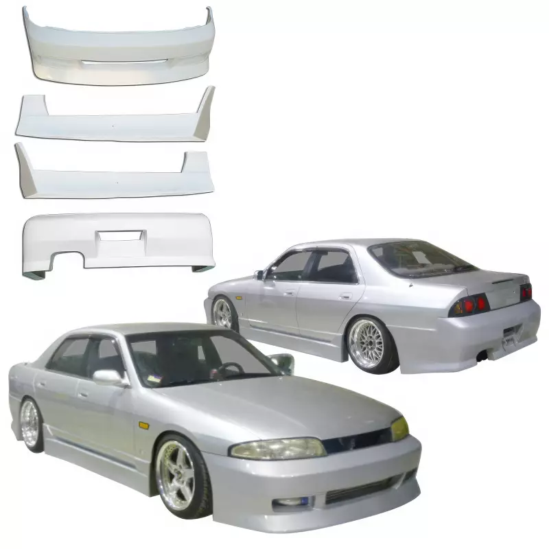 This is a FKON Body Kit 4pc manufactured or distributed by VSaero primarily made of FRP material. VSaero FRP parts are manufactured with fiberglass and plastic resin which strengthens (F)iber (R)einforced (P)lastic. Using FRP allows VSaero to form aggressive styles of various sizes or shapes while still retaining a large degree of strength. When installing new unpainted and unfinished fiberglass parts there may be cracks or surface imperfections that need filled and/or leveled. This should be fixed in the prep stage of installation at a professional body shop. Bolts, screws, and double sided tape are not included. All fiberglass parts require modification, shaving, sanding, drilling, filling in order to ensure proper fitment.