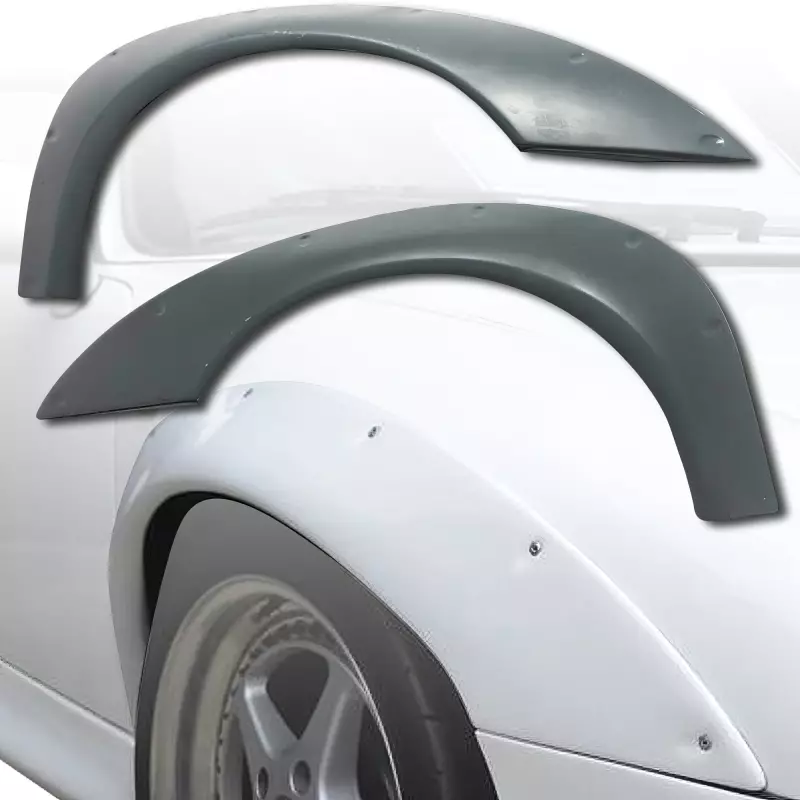This is a GT2 Wide Body Fenders (front) manufactured or distributed by ModeloDrive with FRP being the primary exterior surface material. ModeloDrive FRP (fiberglass) parts are high quality aero parts now available to the US market. ModeloDrive FRP aerodynamics have set a new standard for the fiberglass market. You may need to dry fit the parts and drill holes before prepping and finishing. Fiberglass may have cracks or surface imperfections that need filling and/or leveling. A professional body shop should fix any issues in the prep stage of installation and install the parts. You will need bolts, screws, and double sided tape, which are not included. All ModeloDrive fiberglass parts require modification, shaving, sanding, drilling, filling, cutting to ensure proper fitment but usually less than the competition.