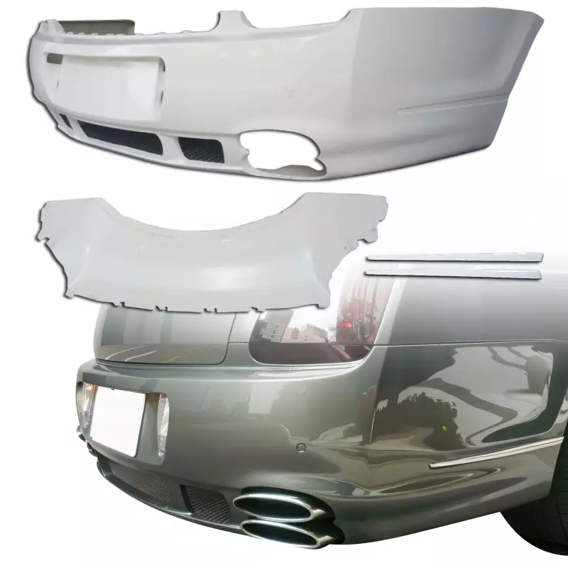 This is a MANS Rear Bumper manufactured or distributed by ModeloDrive with FRP being the primary exterior surface material. ModeloDrive FRP (fiberglass) parts are high quality aero parts now available to the US market. ModeloDrive FRP aerodynamics have set a new standard for the fiberglass market. You may need to dry fit the parts and drill holes before prepping and finishing. Fiberglass may have cracks or surface imperfections that need filling and/or leveling. A professional body shop should fix any issues in the prep stage of installation and install the parts. You will need bolts, screws, and double sided tape, which are not included. All ModeloDrive fiberglass parts require modification, shaving, sanding, drilling, filling, cutting to ensure proper fitment but usually less than the competition.