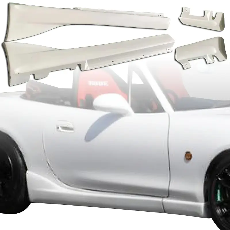 This is a MSPE Side Skirts 4pc manufactured or distributed by ModeloDrive with FRP being the primary exterior surface material. ModeloDrive FRP (fiberglass) parts are made to a higher standard than most mass produced US market fiberglass parts. Holes will not always be pre-drilled so you still will need to dry fit the parts before they can be prepped and finished. Due to the nature of fiberglass there may be cracks or surface imperfections that need filled and/or leveled. This should be fixed in the prep stage of installation at a professional body shop. Bolts, screws, and double sided tape is not included. All ModeloDrive fiberglass parts require modification, shaving, sanding, drilling, filling in order to ensure proper fitment but generally speaking less than the competition.