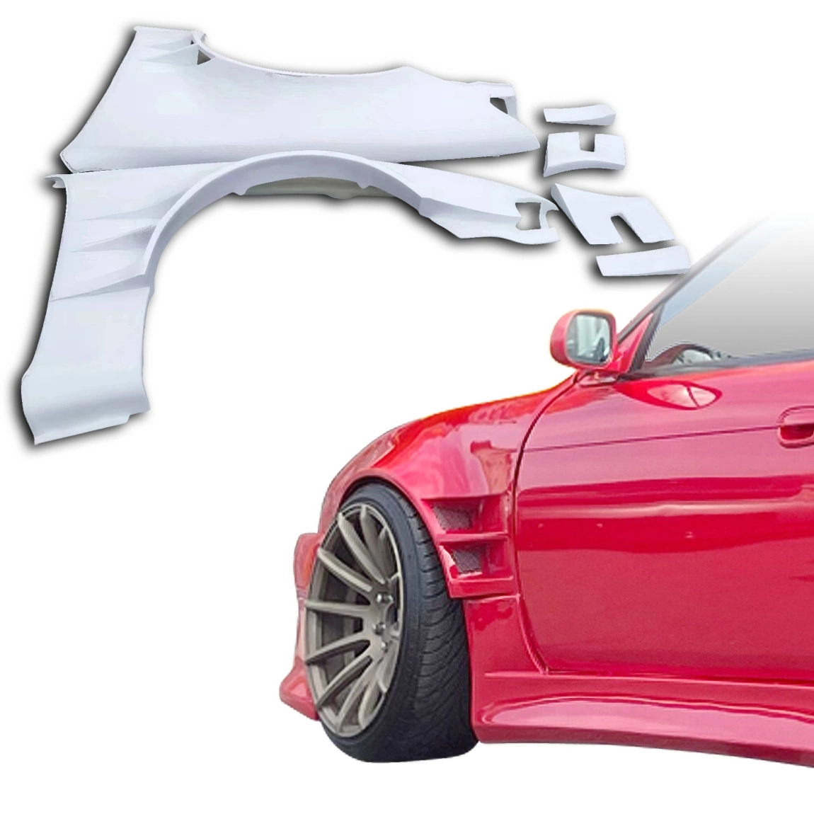 This is a ORI t4 75mm Wide Body Fenders (front) 6pc manufactured or distributed by ModeloDrive with FRP being the primary exterior surface material. ModeloDrive FRP (fiberglass) parts are high quality aero parts now available to the US market. ModeloDrive FRP aerodynamics have set a new standard for the fiberglass market. You may need to dry fit the parts and drill holes before prepping and finishing. Fiberglass may have cracks or surface imperfections that need filling and/or leveling. A professional body shop should fix any issues in the prep stage of installation and install the parts. You will need bolts, screws, and double sided tape, which are not included. All ModeloDrive fiberglass parts require modification, shaving, sanding, drilling, filling, cutting to ensure proper fitment but usually less than the competition.