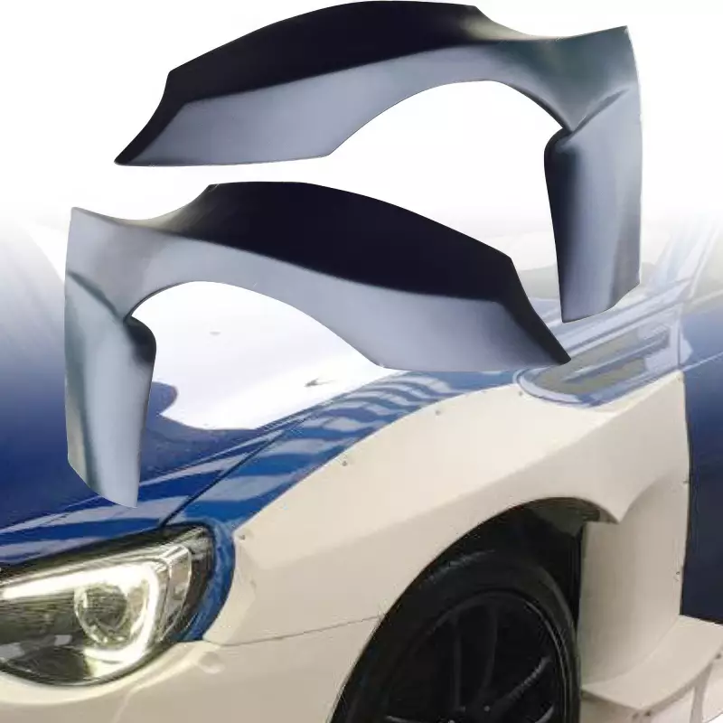 NOTES: This bumper of this kit was originally designed for the FRS, however it will fit the BRZ but keep in mind that the FRS has sharper more pointed headlights so there will be a gap when using BRZ headlights. Does NOT include wing. Wide body flares add-on to your existing metal flares, the purpose of the wide body flare is to allow wider wheels. You will need rivet the flare to your OEM fender and trim or roll the inner portion of your metal fender that is concealed by the flare so that it will accomodate wider wheels without scraping.
