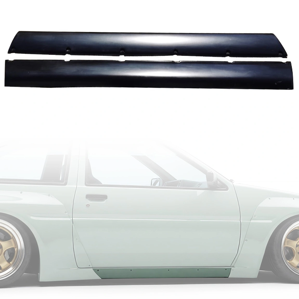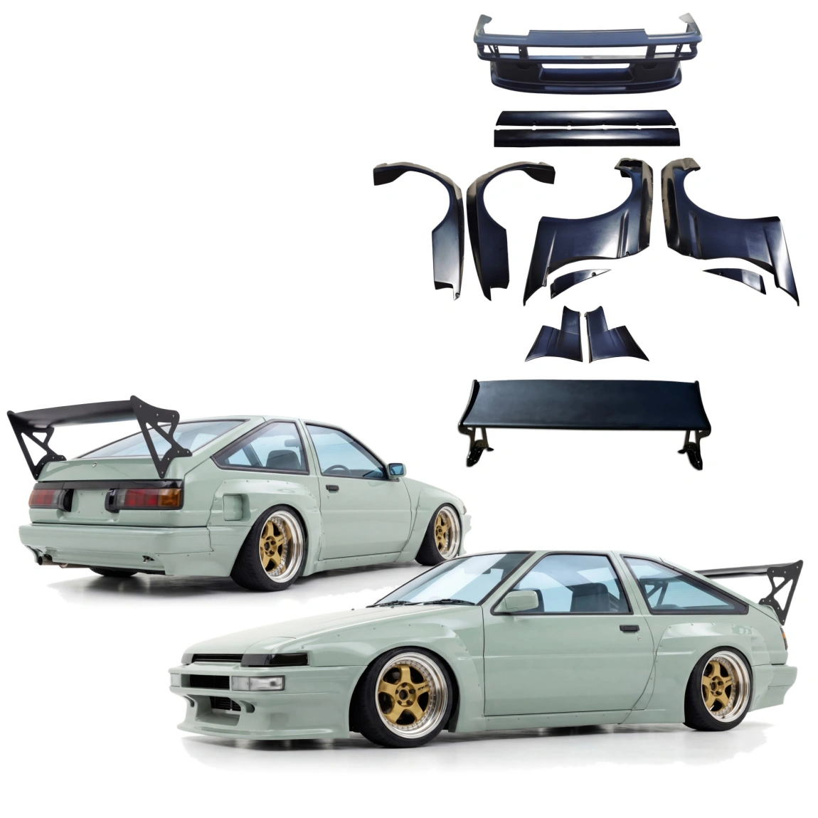 This is a TKYO Wide Body Kit /w GT Wing manufactured or distributed by VSaero primarily made of FRP material. VSaero FRP parts are manufactured with fiberglass and plastic resin which strengthens (F)iber (R)einforced (P)lastic. Using FRP allows VSaero to form aggressive styles of various sizes or shapes while still retaining a large degree of strength. When installing new unpainted and unfinished fiberglass parts there may be cracks or surface imperfections that need filled and/or leveled. This should be fixed in the prep stage of installation at a professional body shop. Bolts, screws, and double sided tape are not included. All fiberglass parts require modification, shaving, sanding, drilling, filling in order to ensure proper fitment.