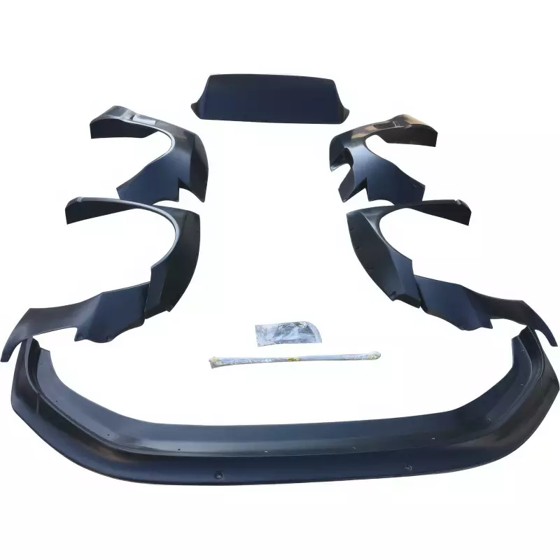 This is a TKYO Wide Body Kit w Wing 8pc manufactured or distributed by VSaero primarily made of FRP material. VSaero FRP parts are manufactured with fiberglass and plastic resin which strengthens (F)iber (R)einforced (P)lastic. Using FRP allows VSaero to form aggressive styles of various sizes or shapes while still retaining a large degree of strength. When installing new unpainted and unfinished fiberglass parts there may be cracks or surface imperfections that need filled and/or leveled. This should be fixed in the prep stage of installation at a professional body shop. Bolts, screws, and double sided tape are not included. All fiberglass parts require modification, shaving, sanding, drilling, filling in order to ensure proper fitment.