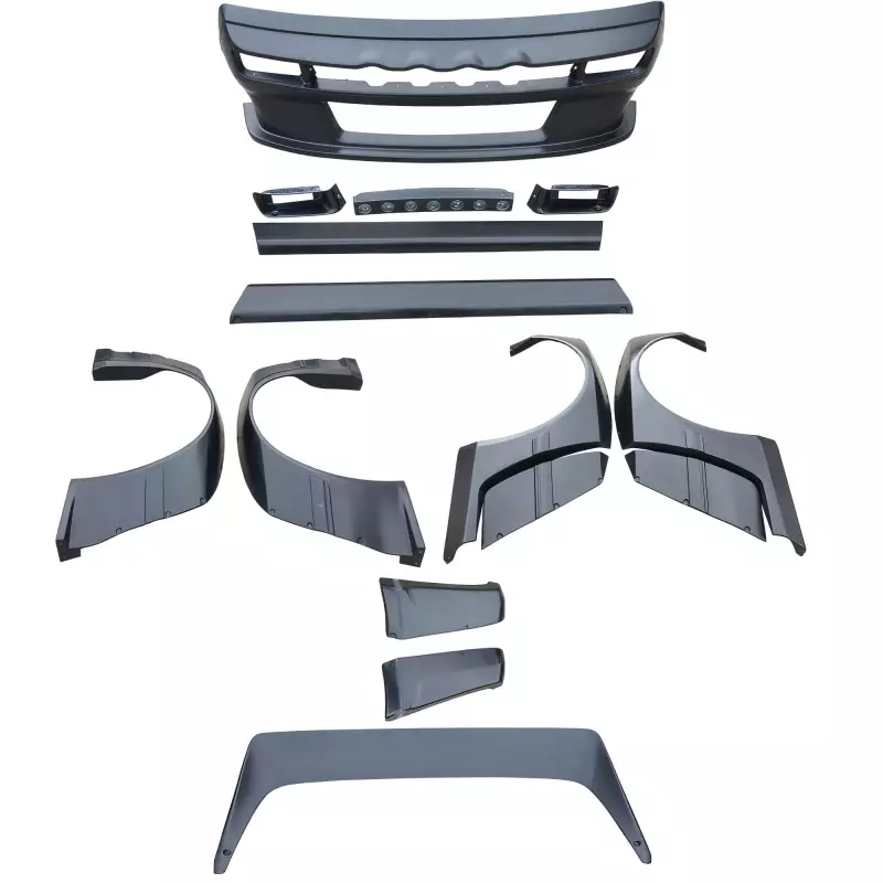 This is a TKYO Wide Body Smooth Kit w Wing manufactured or distributed by VSaero primarily made of FRP material. VSaero FRP parts are manufactured with fiberglass and plastic resin which strengthens (F)iber (R)einforced (P)lastic. Using FRP allows VSaero to form aggressive styles of various sizes or shapes while still retaining a large degree of strength. When installing new unpainted and unfinished fiberglass parts there may be cracks or surface imperfections that need filled and/or leveled. This should be fixed in the prep stage of installation at a professional body shop. Bolts, screws, and double sided tape are not included. All fiberglass parts require modification, shaving, sanding, drilling, filling in order to ensure proper fitment.