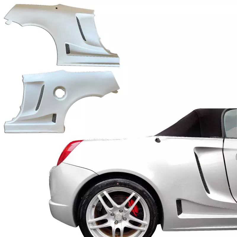 This is a TR-VM80 Wide Body Fenders (rear) manufactured or distributed by ModeloDrive with FRP being the primary exterior surface material. ModeloDrive FRP (fiberglass) parts are high quality aero parts now available to the US market. ModeloDrive FRP aerodynamics have set a new standard for the fiberglass market. You may need to dry fit the parts and drill holes before prepping and finishing. Fiberglass may have cracks or surface imperfections that need filling and/or leveling. A professional body shop should fix any issues in the prep stage of installation and install the parts. You will need bolts, screws, and double sided tape, which are not included. All ModeloDrive fiberglass parts require modification, shaving, sanding, drilling, filling, cutting to ensure proper fitment but usually less than the competition.
