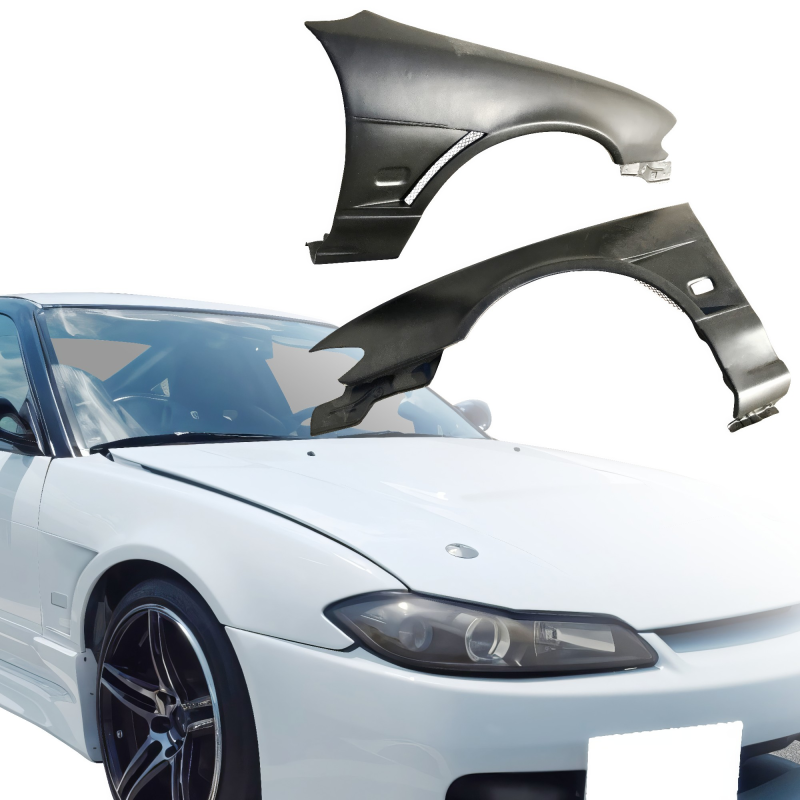 This is a MSPO S13.5 Conversion Fenders (front) manufactured or distributed by VSaero primarily made of FRP material. VSaero FRP parts are manufactured with fiberglass and plastic resin which strengthens (F)iber (R)einforced (P)lastic. Using FRP allows VSaero to form aggressive styles of various sizes or shapes while still retaining a large degree of strength. When installing new unpainted and unfinished fiberglass parts there may be cracks or surface imperfections that need filled and/or leveled. This should be fixed in the prep stage of installation at a professional body shop. Bolts, screws, and double sided tape are not included. All fiberglass parts require modification, shaving, sanding, drilling, filling in order to ensure proper fitment.