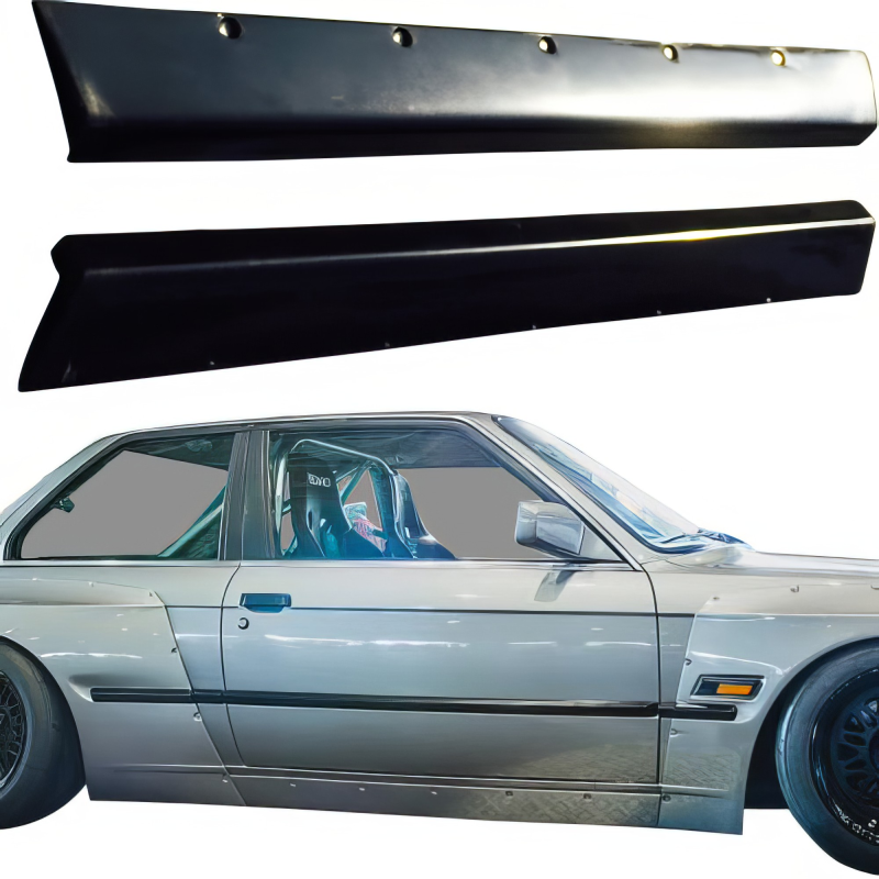 This is a TKYO Wide Body Side Skirts manufactured or distributed by VSaero primarily made of FRP material. VSaero FRP parts are manufactured with fiberglass and plastic resin which strengthens (F)iber (R)einforced (P)lastic. Using FRP allows VSaero to form aggressive styles of various sizes or shapes while still retaining a large degree of strength. When installing new unpainted and unfinished fiberglass parts there may be cracks or surface imperfections that need filled and/or leveled. This should be fixed in the prep stage of installation at a professional body shop. Bolts, screws, and double sided tape are not included. All fiberglass parts require modification, shaving, sanding, drilling, filling in order to ensure proper fitment.